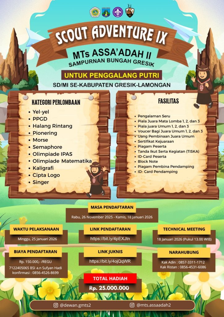 Dengan penuh semangat kepramukaan dan sebagai wadah berkembangnya generasi muda yang kreatif, terampil, serta berkarakter, MTs Assa’adah II kembali menghadirkan SCOUT ADVENTURE IX, dimana kegiatan ini diselenggarakan khusus bagi Penggalang Putri MI/SD se-Kabupaten Gresik–Lamongan. kegiatan Scout Adventure Pada tahun ini mengangkat tema “ACAK (Aktif, Cerdas, Atraktif, & Kreatif)”